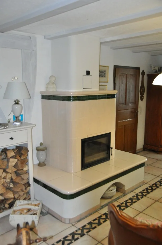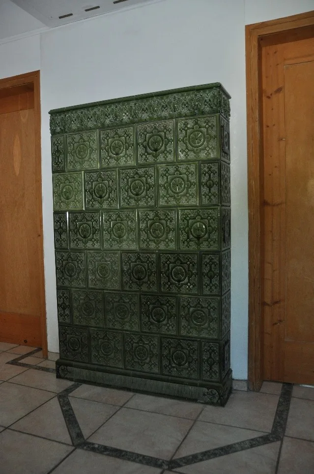 Besonderes Highlight ist der sogenannte „Satellit“: eine vom Hauptofen beheizte Herzwand im Obergeschoss, die mit alten Kacheln verkleidet wurde und für zusätzliche Wärme im Wohnbereich sorgt.